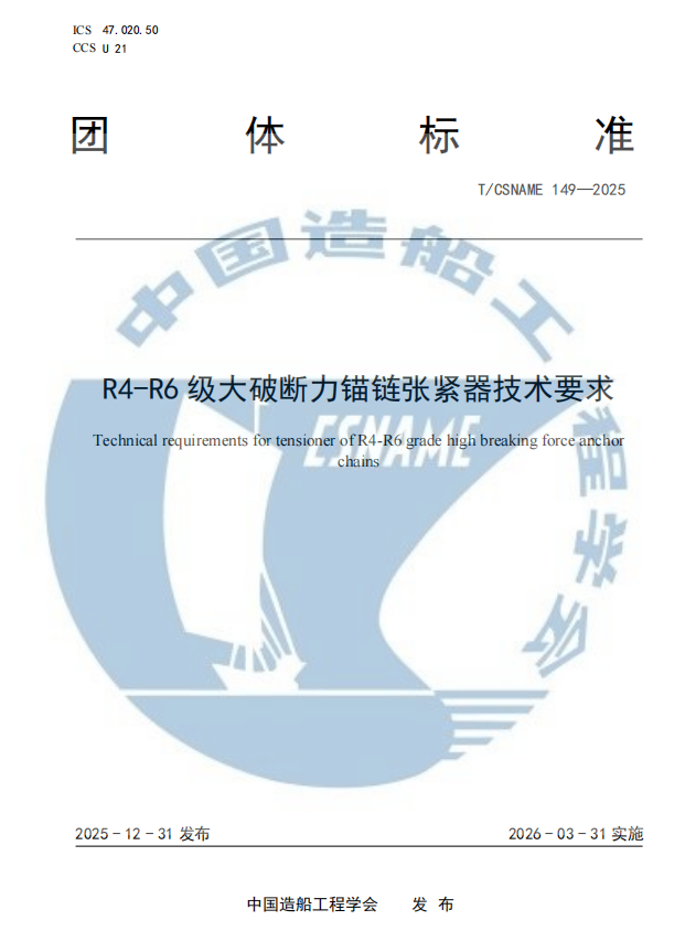 Recently, Nantong Just-Sea Offshore Equipment CO.,LTD. (hereinafter referred to as "Just-Sea Offshore") independently drafted and compiled the "Technical Requirements for R4-R6 High Breaking Force Anchor Chain Guides" (T/CSNAME 147—2025) and the "Technical Requirements for R4-R6 High Breaking Force Anchor Chain Universal Joints" (T/CSNAME 148—2025)、The three group standards for "Technical Requirements for R4-R6 High Breaking Force Anchor Chain Tensioners" (T/CSNAME 149—2025) were officially released by the China Shipbuilding Engineering Society on December 31, 2025, and will be fully implemented from March 31, 2026. The drafting of these three group standards was led by Just-Sea Offshore, with participation from Jiangsu Provincial Ship and Ocean Engineering Equipment Technology Innovation Center, Nantong Pengrui Marine Engineering Technology Co., Ltd., PowerChina Zhongnan Engineering Corporation Limited, Jiangsu University of Science and Technology, and other units. The successful release of these three standards is not only an important achievement of Just-Sea Offshore deep exploration in the field of ship and ocean engineering equipment and standardization construction, but also a key measure for enterprises to accurately meet the needs of the industry's green and intelligent transformation, lead industrial upgrading with technical standards, and promote the high-quality development of China's shipbuilding industry.