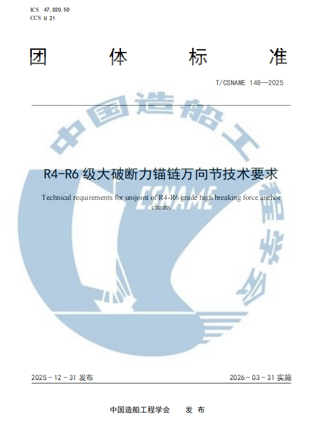 近日,由南通集海海洋装备有限公司(以下简称“集海海装”)自主起草编写的《R4-R6 级大破断力锚链导链器技术要求》(T/CSNAME 147—2025)、《R4-R6级大破断力锚链万向节技术要求》(T/CSNAME 148—2025)、《R4-R6级大破断力锚链张紧器技术要求》(T/CSNAME 149—2025)3项团体标准,于2025年12月31日通过中国造船工程学会正式发布,自2026年3月31日起全面实施。3项团体标准由集海海装牵头起草,江苏省船舶与海洋工程装备技术创新中心、南通鹏瑞海工科技有限公司、中国电建集团中南勘测设计研究院有限公司、江苏科技大学等单位参与了标准起草。此次3项标准的成功发布,既是集海海装深耕船舶与海洋工程装备领域、深耕标准化建设的重要成果,更是企业精准对接行业绿色化、智能化转型需求,以技术标准引领产业升级,助力我国造船产业高质量发展的关键举措。